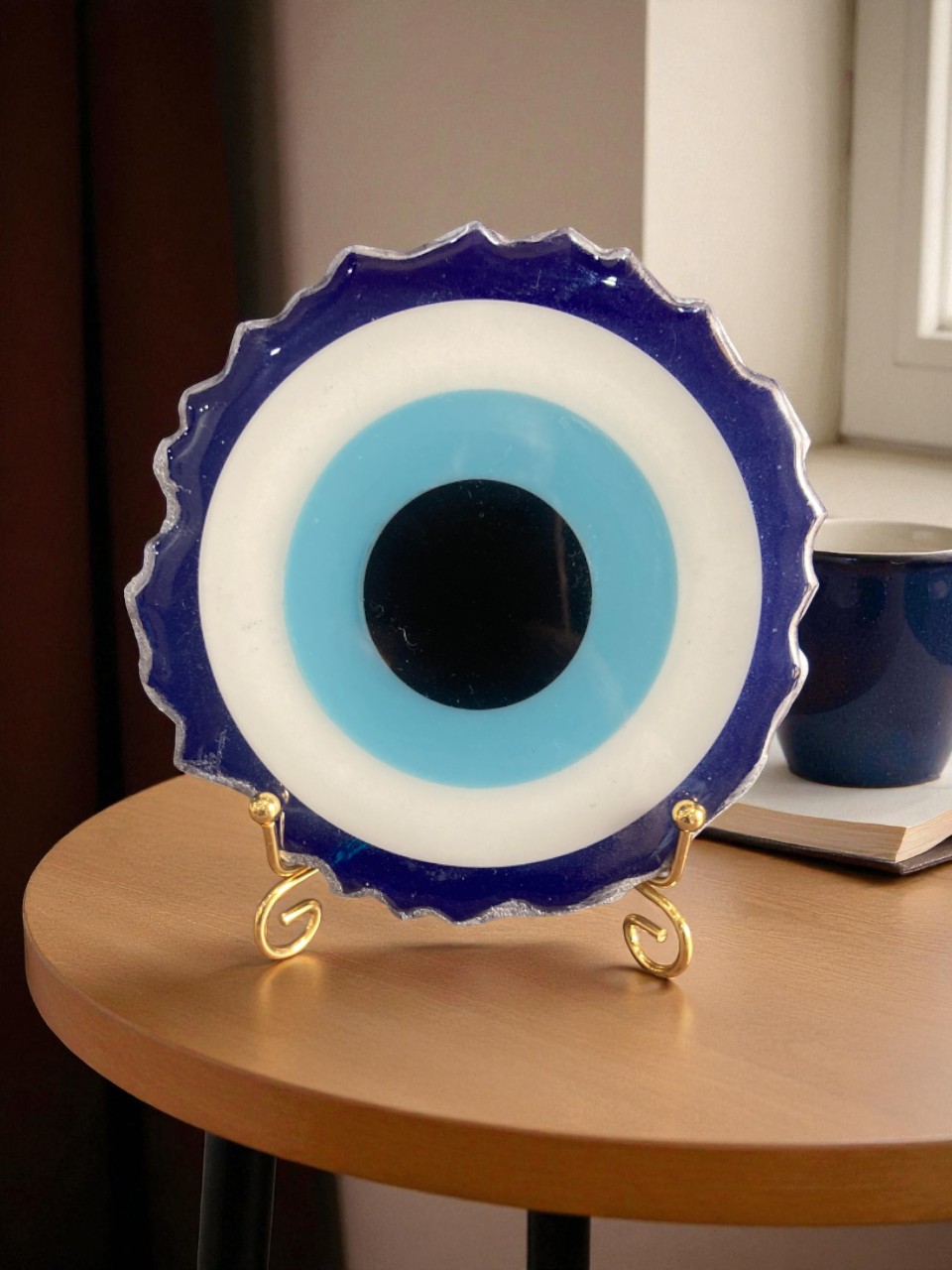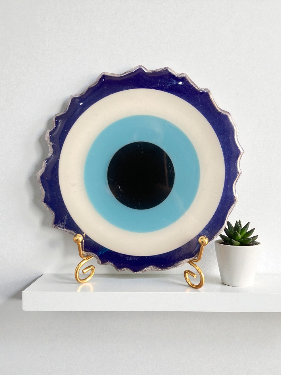 - This evil eye stand has a wavy, organically shaped edge that adds a unique artisanal touch, and it comes displayed on an elegant gold metal stand—perfect for placing on a shelf, tabletop, or entryway console. Its smooth, glass-like resin finish enhances the colors and gives the piece a luxurious, modern look.