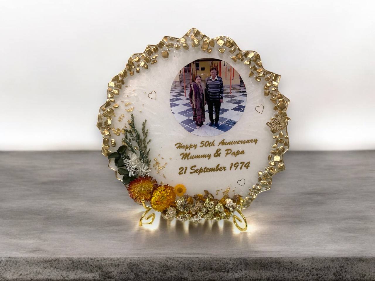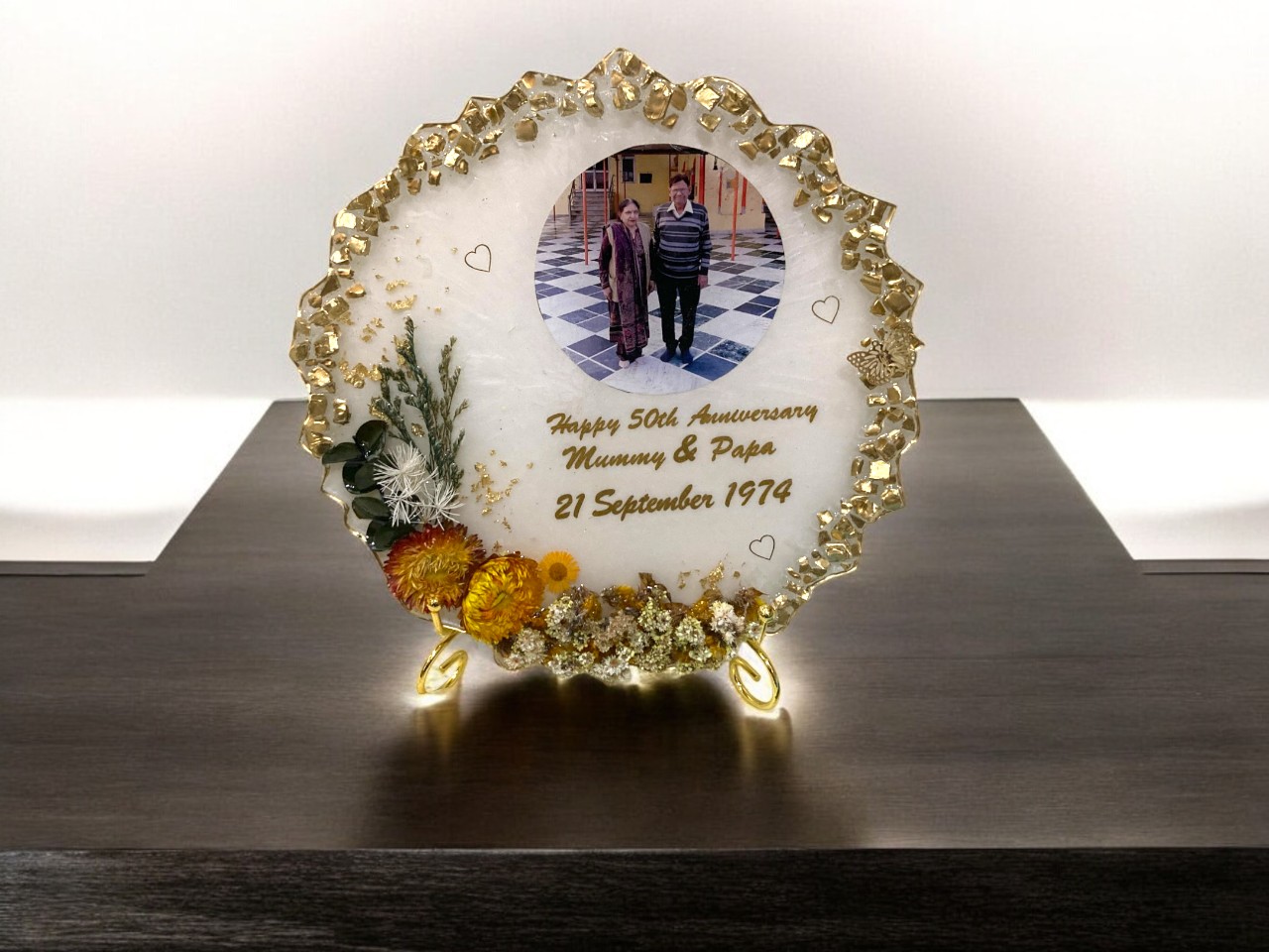 - Resin Anniversary Frame : Preserve your wedding memories for a lifetime with this elegant, customized golden jubilee frame. Adorned with sparkling golden and clear crystals on both sides, it not only enhances your cherished photo but also adds a touch of positivity and grace to your home décor.