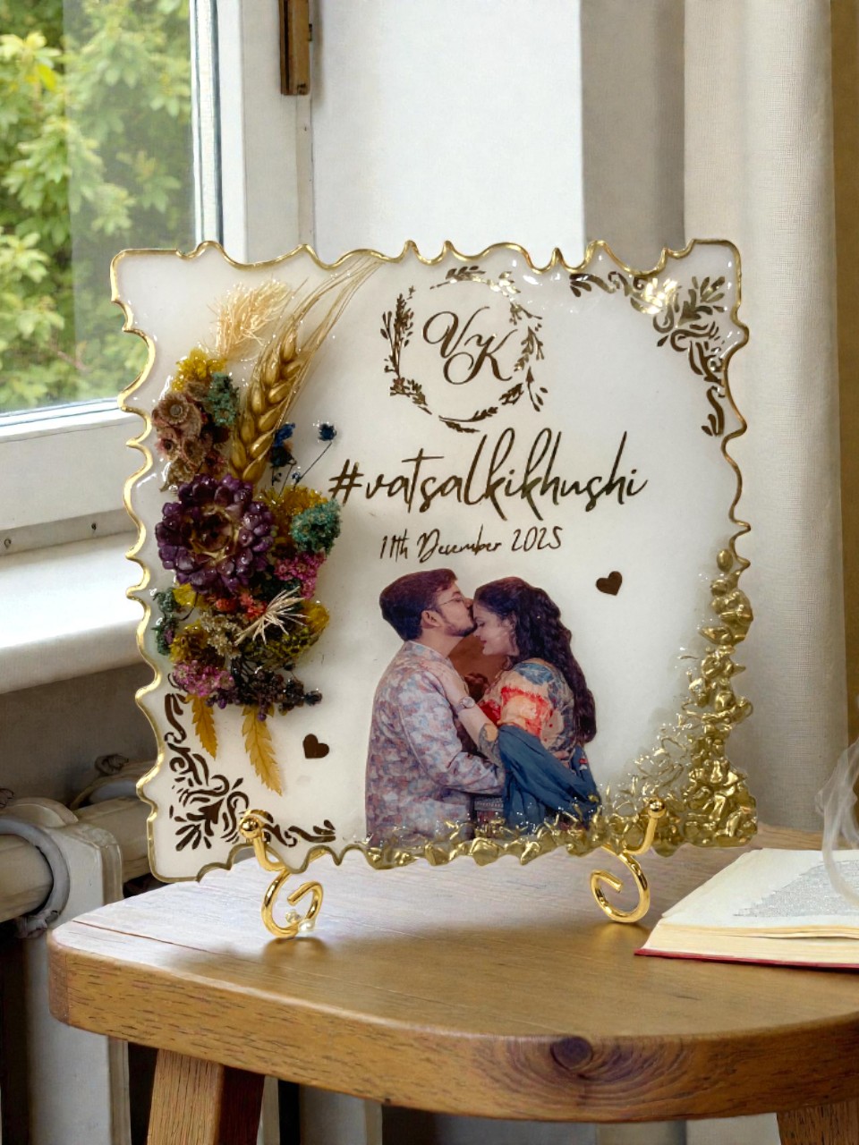 - Discover our Handmade Frame, a premium personalized gift perfect for weddings, anniversaries, engagements, and romantic celebrations. This elegant resin photo frame features a luxurious gold-edged design, real preserved flowers, and customizable details such as names, initials, hashtags, and special dates. Crafted with high-quality resin, the frame showcases your favorite couple photo in a glossy, long-lasting finish that won’t fade over time. Whether you’re searching for a personalized anniversary gift, custom couple frame, wedding gift for couples, or romantic home décor, this resin art piece is the perfect choice.