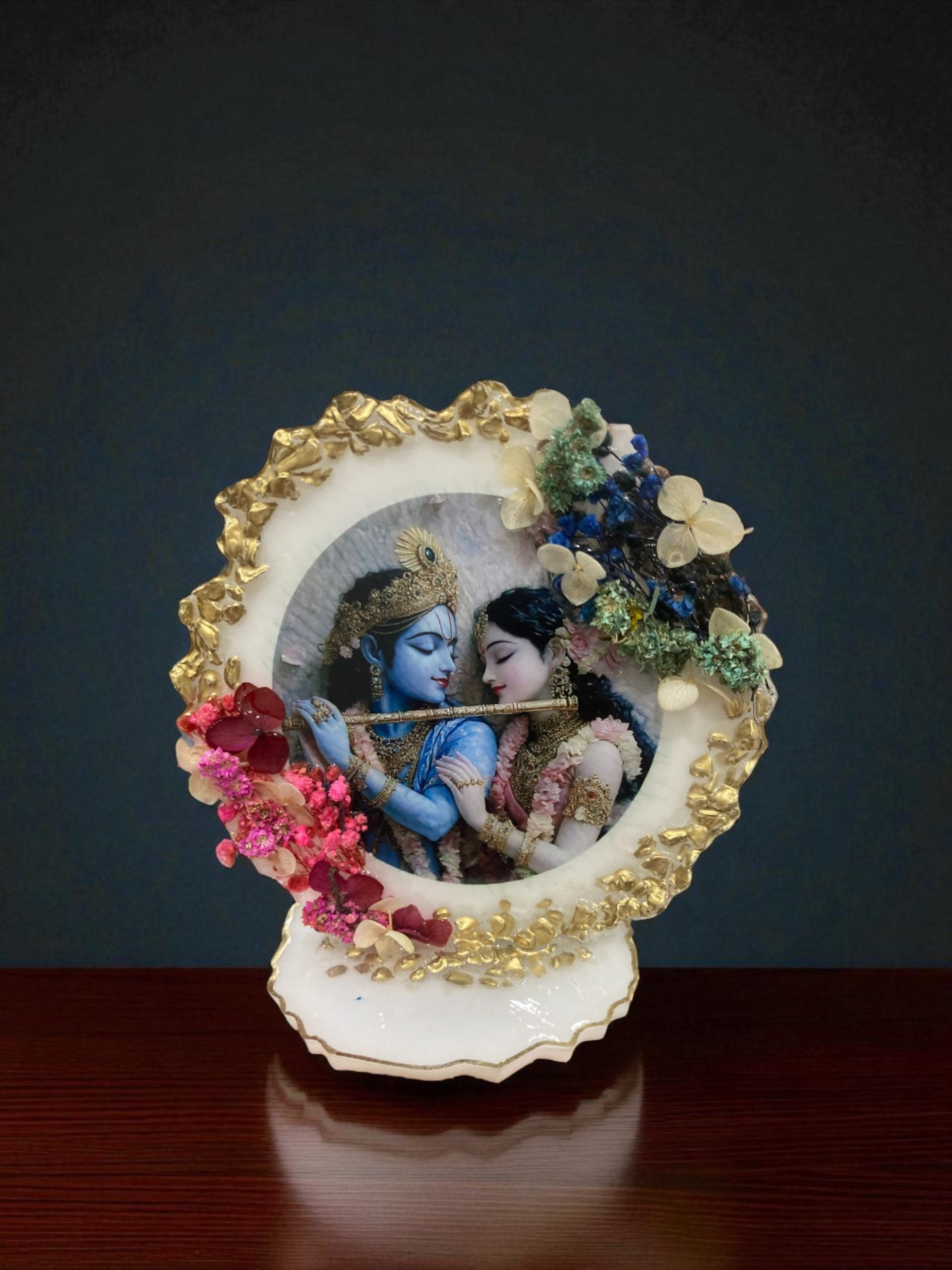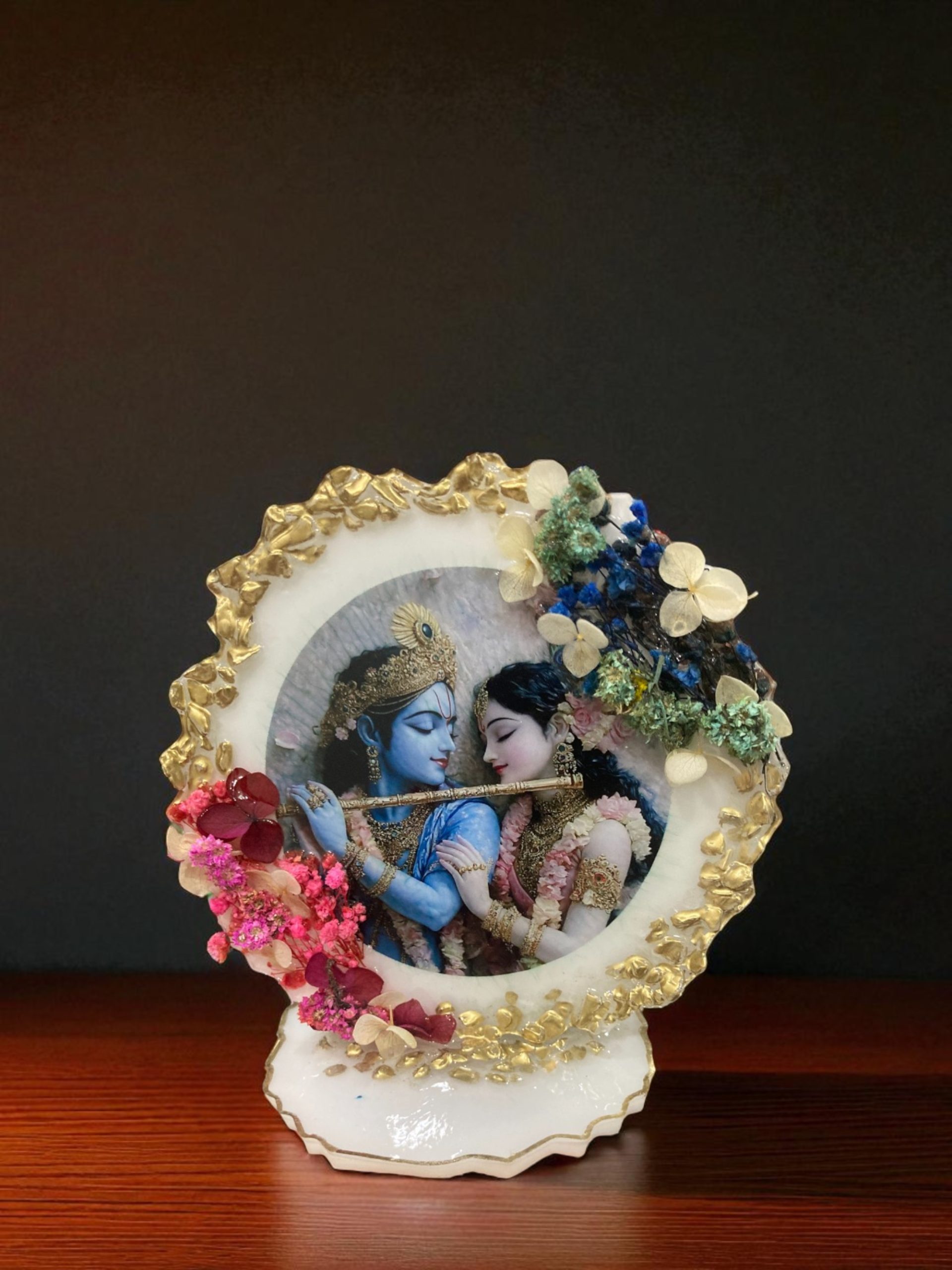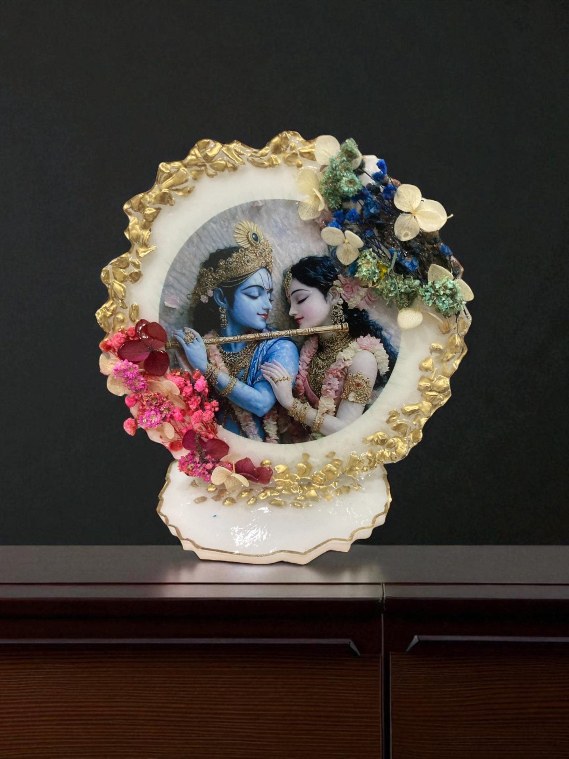 - This radha krishna stand is finished with delicate original dried flowers, capturing the grace and spiritual essence of Vrindavan’s timeless love story. This Radha Krishna Resin Art ensures long-lasting beauty while being lightweight and easy to mount.