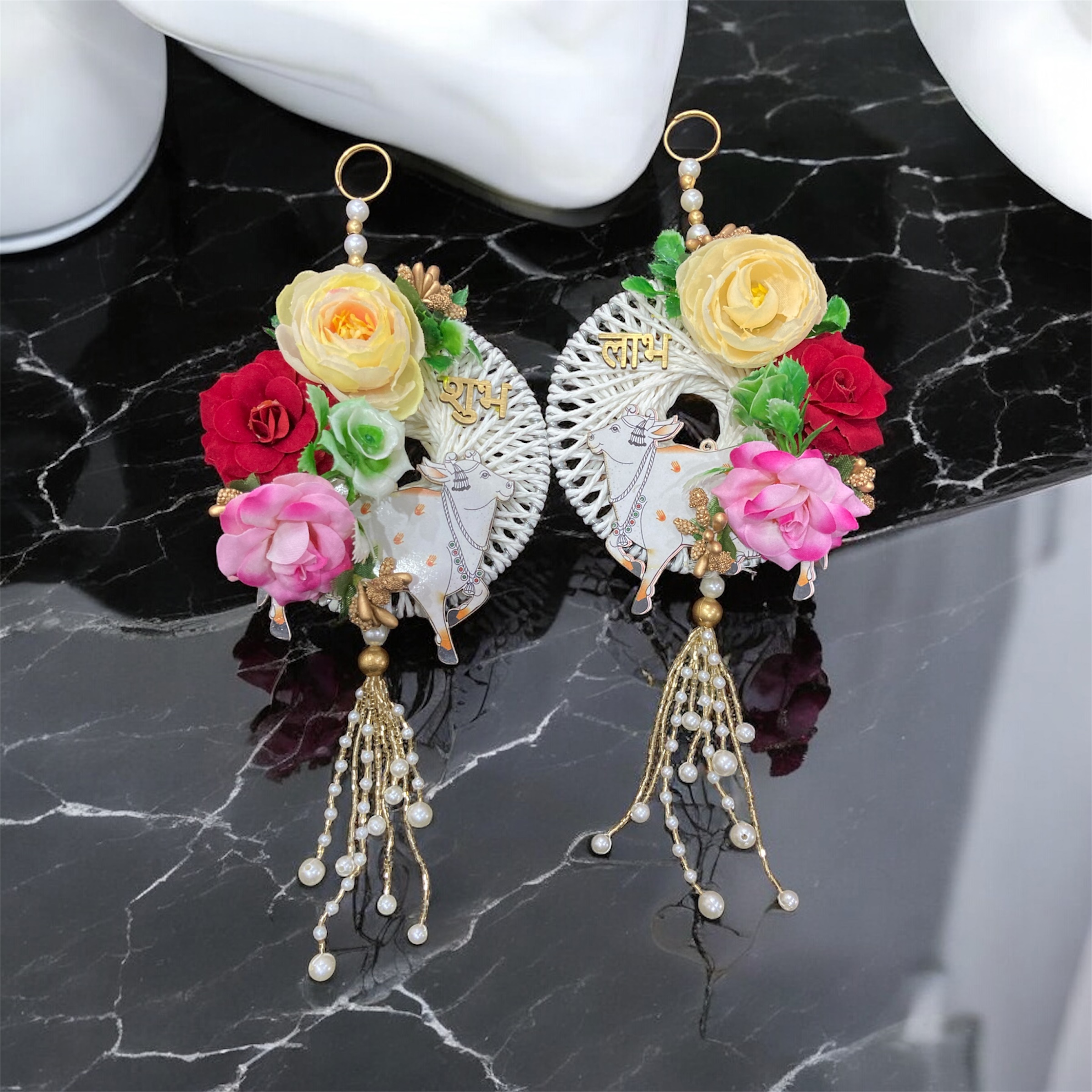 Each hanging is designed with intricate details, vibrant colors, and auspicious motifs like Swastik, Kalash, Ganesha, or Lotus, creating a festive ambiance that radiates warmth and blessings. Whether you’re celebrating Diwali, Navratri, or a special occasion, these hangings serve as a timeless reminder of good fortune and harmony. Beautiful handcrafted resin shubh labh hanging pair to adorn your door this diwali.
