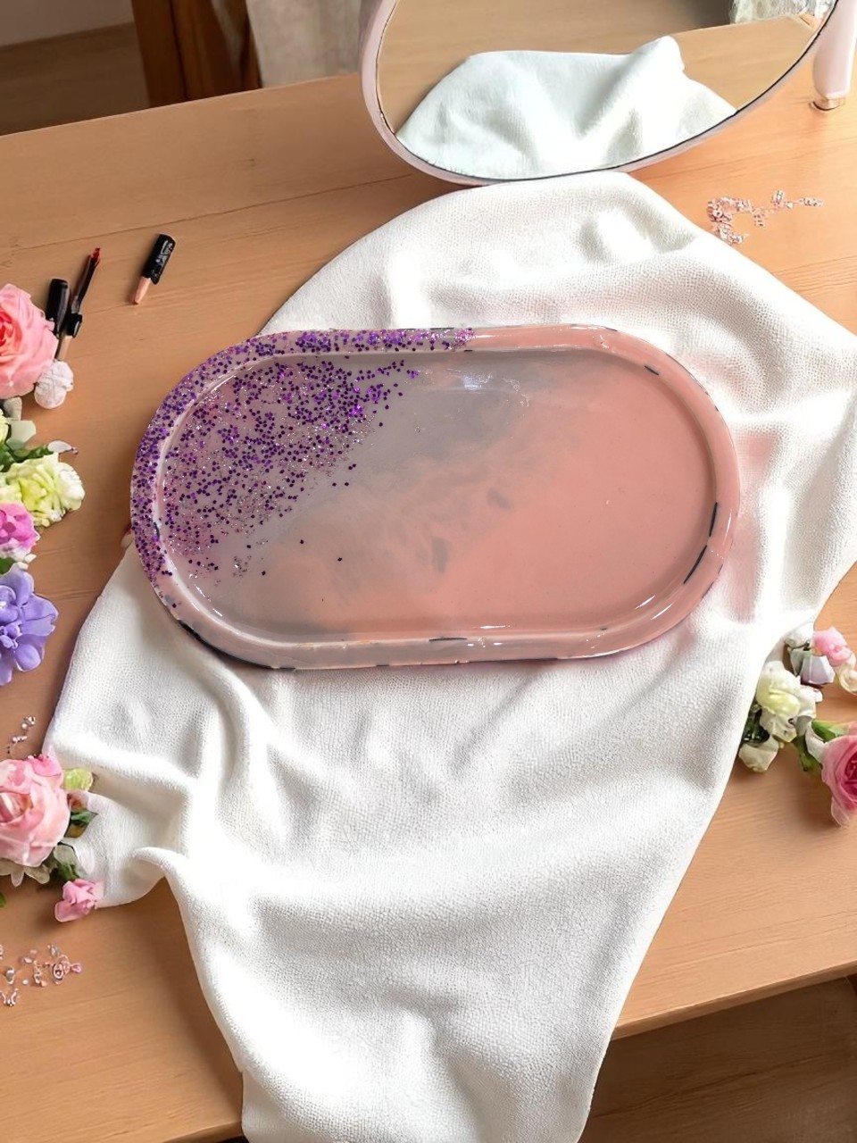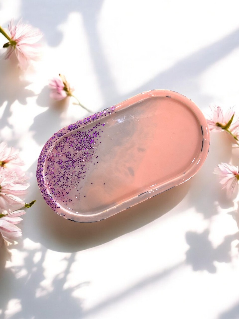 - Trinket Tray : Elevate your space with a handmade resin trinket tray, perfect for storing jewelry, keys, candles, coins, crystals, or other small treasures. Fully customizable with your choice of colors, designs, initials, dried flowers, glitter, or gold flakes – each piece is one of a kind!